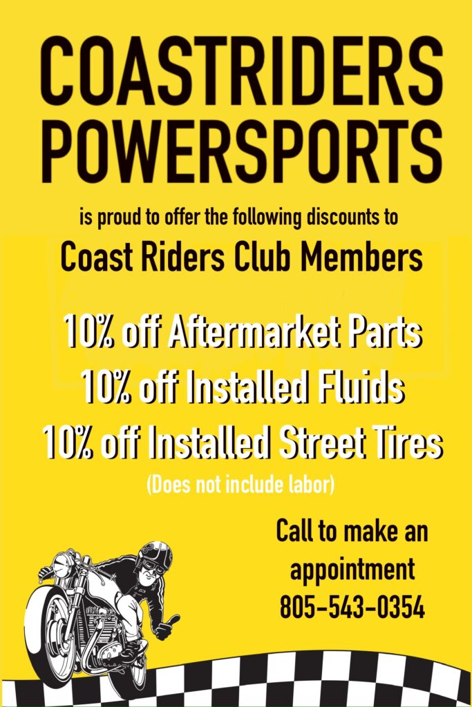 Show your Coast Riders Membership Card and receive a 10% discount on all parts and in-house labor!
